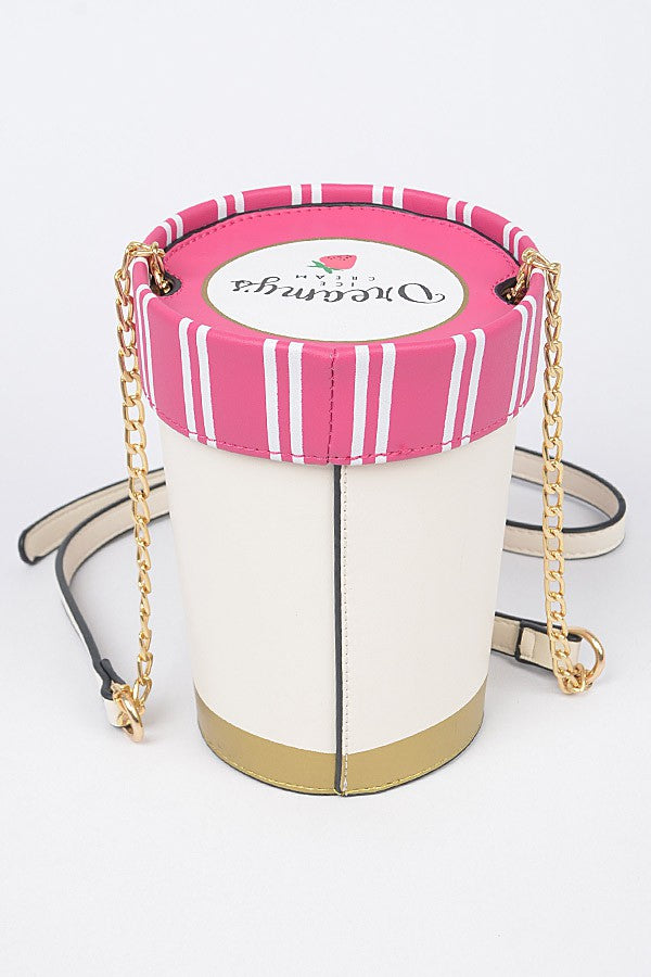 Turn heads with this Strawberry Ice Cream Pint Crossbody Bag — a sweet and playful accessory inspired by everyone’s favorite frozen treat! Shaped like a one-pint ice cream container, it features vibrant pink and white striped accents, "Dreamy’s Ice Cream" label, and a rich gold base for an extra touch of chic. With a mix of a gold chain and faux leather adjustable strap, it's as functional as it is fun.