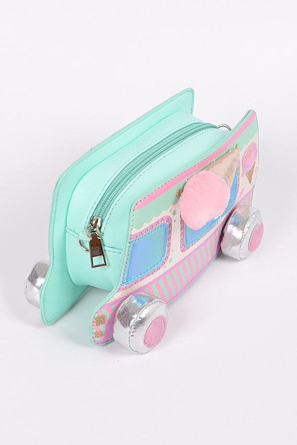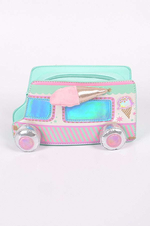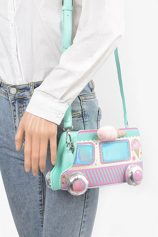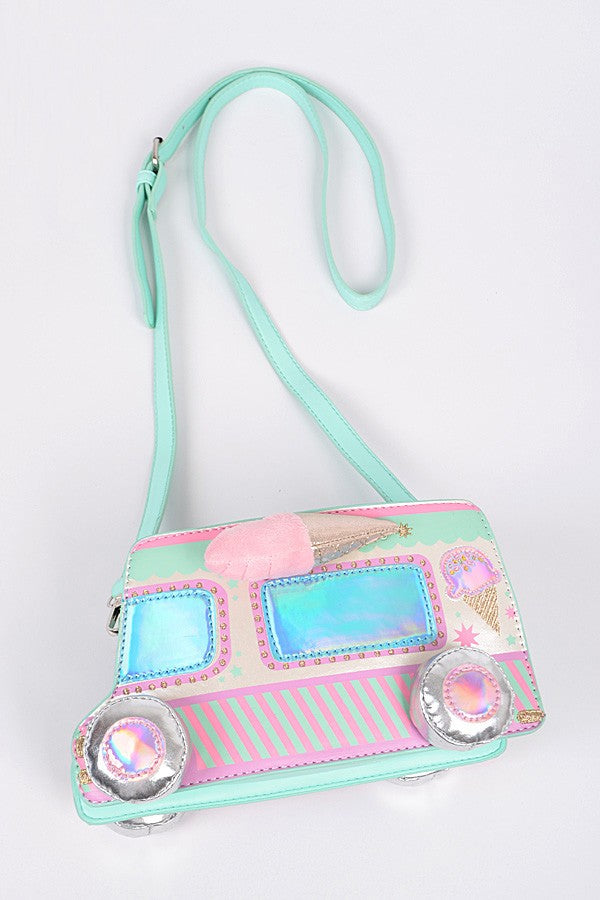 Keywords: ice cream truck purse, novelty crossbody bag, pastel handbag, holographic bag, cute summer accessories, kawaii fashion, fun purse for girls